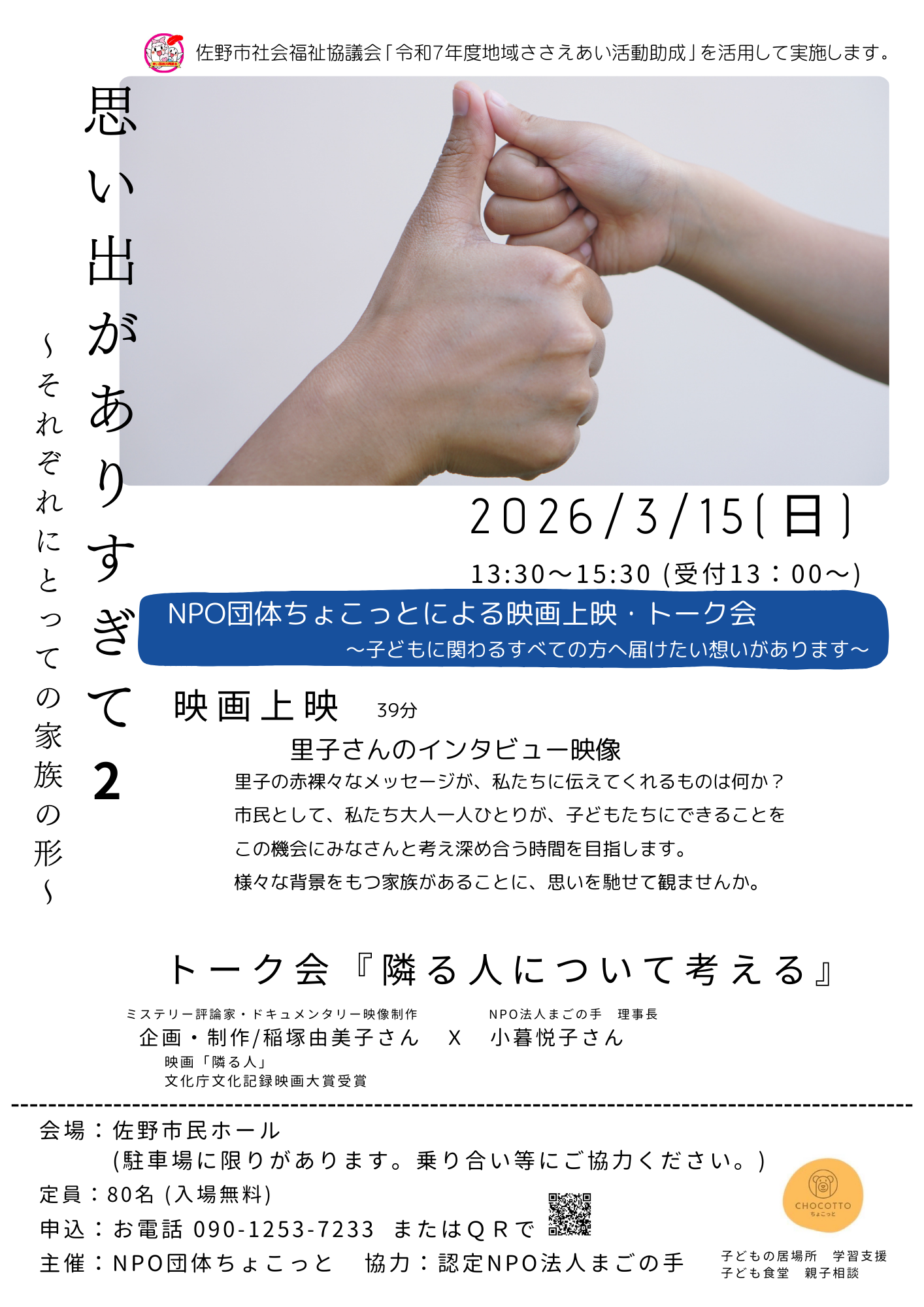 今回の上映会では、里子さんお一人に焦点あてて上映。上映後、トーク会もあり。本作を制作した稲塚由美子(「隣る人」工房)もトークに参加します。
